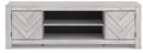 This TV stand with electric fireplace embraces a classically charming aesthetic and repurposes it for modern living. Its dark charcoal finish appeals to your love of vintage character, while a chic chevron pattern is effortlessly on trend. Media accessories stay tucked away in style thanks to hidden storage behind the doors. And for added ambiance, the electric fireplace brings a cozy-cool vibe to your living room. With the touch of a button, activate the LED-lit flame and adjust the temperature or the flame brightness. The flame effect includes multiple color options and a realistic-looking faux birch log set.