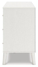 Dare to take minimalism to the max. This dresser has an air of sleek simplicity thanks to its white painted finish with subtle replicated wood grain. The magnificently mod splay legs are a compelling complement to its streamlined design. And with two sets of faux leather drawer pulls that allow you to customize the dresser to suit your space, there's no doubt about it: This contemporary piece is sure to become a classic.
